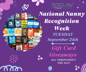 Nanny Appreciation Week celebrates our almost 300 hundred nannies with some raffles throughout the week. We will be drawing names daily, every nanny gets an entry, plus an additional entry for those on our babysitting list (not too late to join, email if you are interested in picking up occasional babysitting hours). Also will post daily on FaceBook and Instagram, if you share or comment you will be entered an additional time.