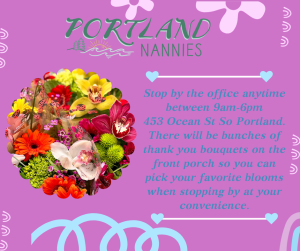 MONDAY Stop by Broadway Gardens, 1640 Broadway South Portland, between the hours of 3pm-7pm and pick up a thank you bouquet of flowers. Go to the main building and Eva will put together a nice arrangement for you, courtesy of Portland Nannies.