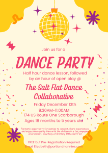Please join us on Friday December 13th at 9:30am for a complimentary intro dance lesson at the Salt Flat Dance for kiddos ages 18 months to 5 years old and then an hour of free play after.