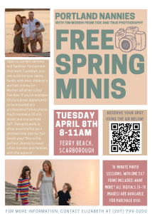 Portland Nannies Spring Minis, Open to current agency nannies and families on Tuesday April 8th at Ferry Beach, Scarborough! Enjoy a free 10-minute photo session from 8 AM to 11 AM, with one 5x7 print included. Reserve your spot today!